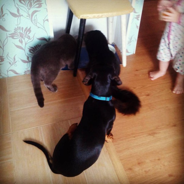 Коты организованной группировкой подъедают таксячью еду. Сожрали всё и пошли свой корм подъедать ^_^