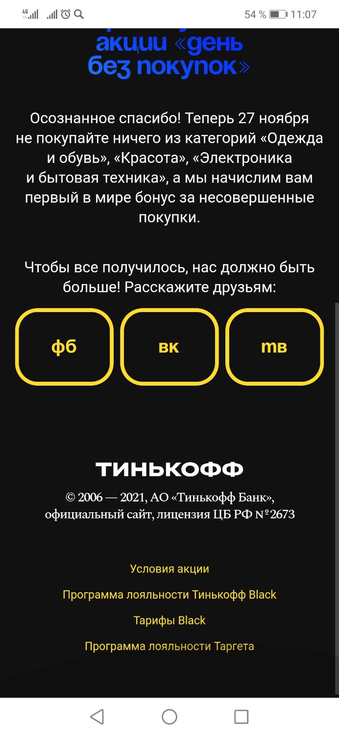 koshechka.84 1494 Опубликовано: 18 ноября 2021 Рассказать Опубликовано: 18 ноября 2021 (изменено) на тинькофф акция отказ от покупок 27.11.2021, кешбек на карту, правда маленький 100 руб, мелочь, но приятно promo-no-shopping-day-2021-11-12-08-45-25.pdf Изменено 18 ноября 2021 пользователем koshechka.84 4 Ссылка на сообщение Поделиться на других сайтах